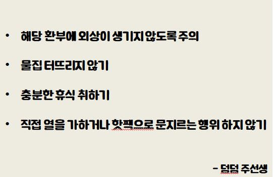 동창, 동상 치료 시 피부에 손상이 가지 않도록 아래와 같은 사항을 지키는 것 중요합니다.