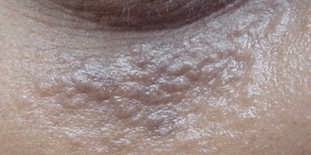 한관종은 주로 눈밑에 발생하며, 피부의 진피층에 있는 땀을 분비하는 관이 비정상적으로 늘어나 나타납니다. 1~3mm 크기의 피부색 또는 황색의 작은 구진들이 오돌토돌 올라와 개구리알처럼 보이는 게 특징입니다.
