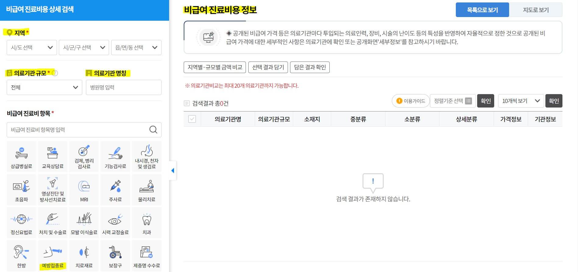 2. 비급여 진료비용 정보 창