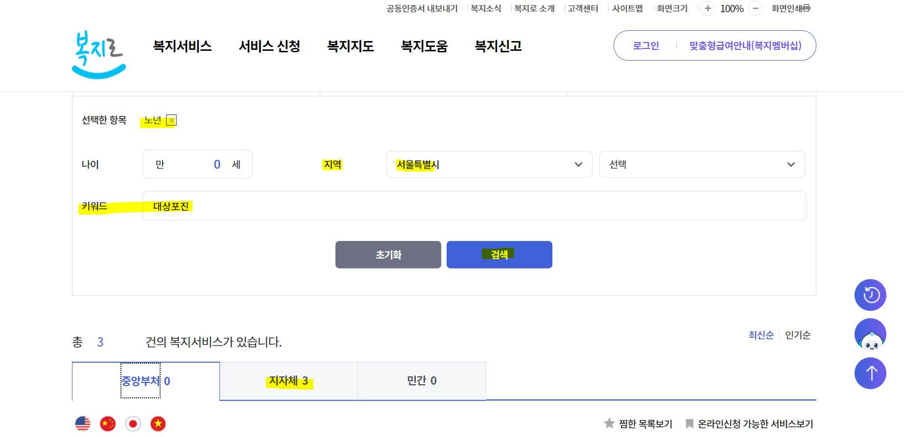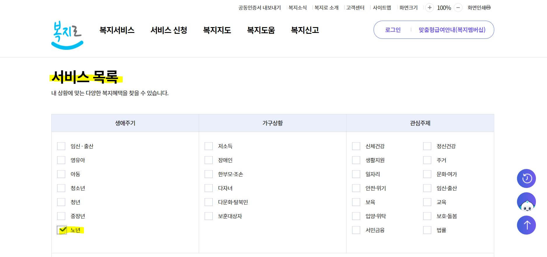 2. 복지서비스 -> 서비스 목록 -> 노년을 선택