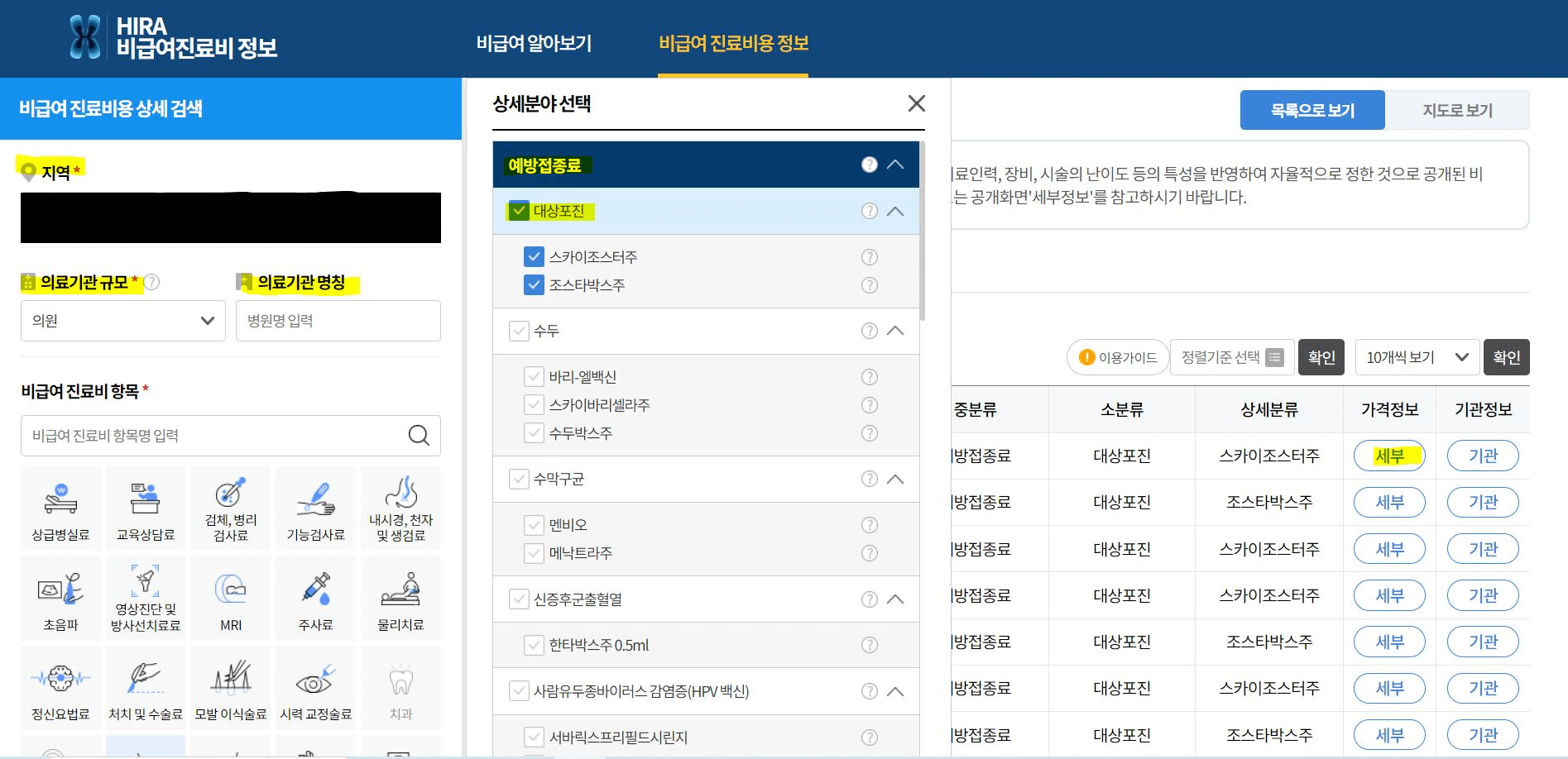 세부 선택하면 해당 병원 가격 확인할 수 있음