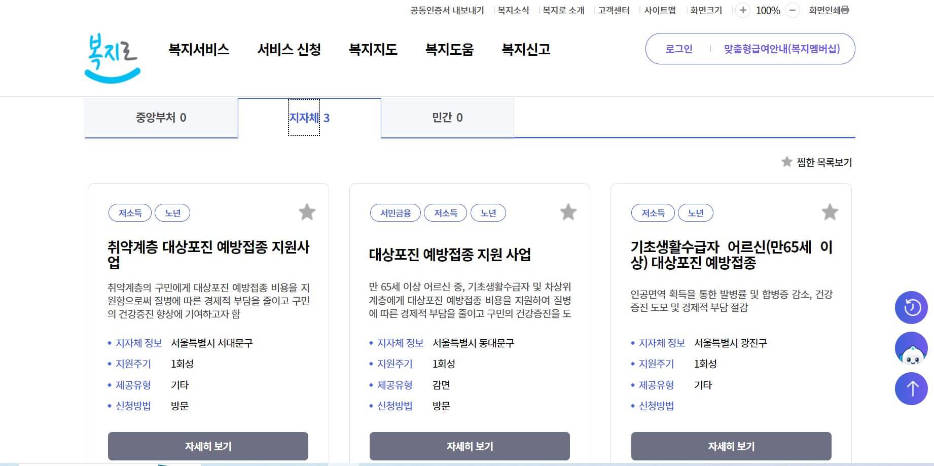 대상포진 예방접종은 대부분의 지자체 지역보건소에서 만 65세 이상 어르신들을 상대로 최대 1회 무료 접종을 지원하고 있습니다. 생백신 종류를 주로 지원하고 있으며, 복지로 홈페이지에서 거주하고 있는 지자체 지원 여부를 확인할 수 있습니다.